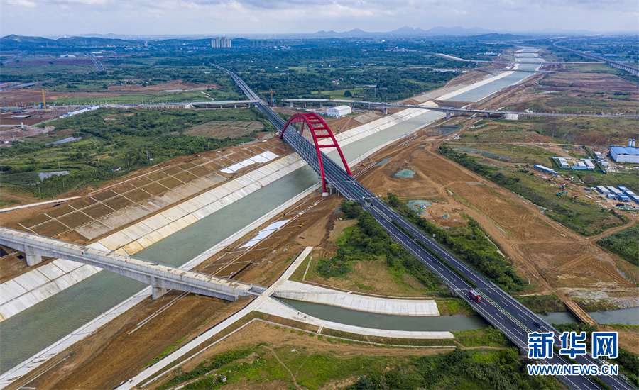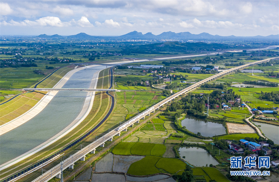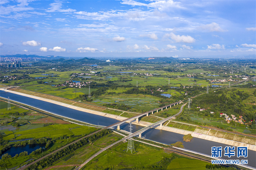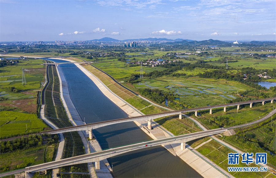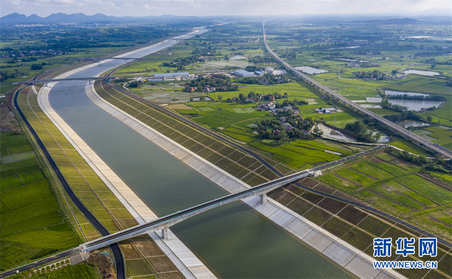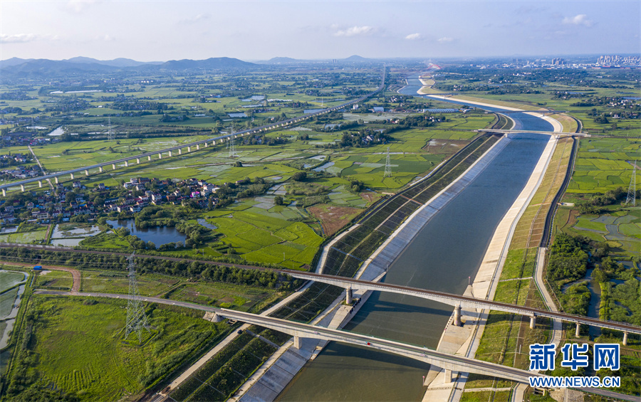 6月28日,安徽省合肥市廬江縣柯坦鎮(zhèn)境內的引江濟淮工程雄姿展現(xiàn),河道、高鐵、公路在綠野中交匯,景美如畫。