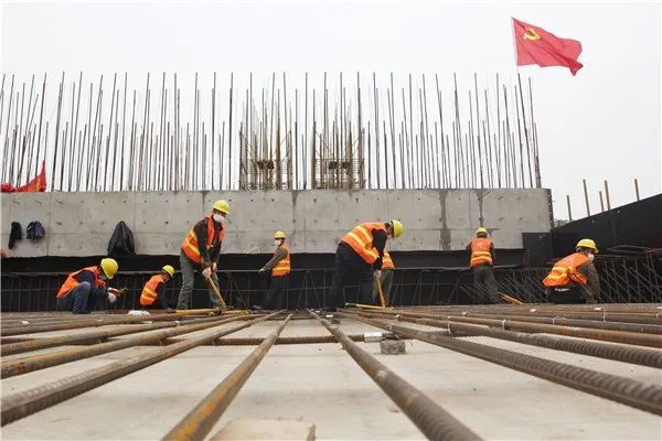 在引江濟(jì)淮工程樅陽(yáng)樞紐節(jié)制閘施工現(xiàn)場(chǎng),從高處望去,工地上一片繁忙景象,幾臺(tái)挖掘機(jī)揮動(dòng)著“機(jī)械臂”,戴著安全帽和白色口罩的工人們正在鋪設(shè)鋼筋。
