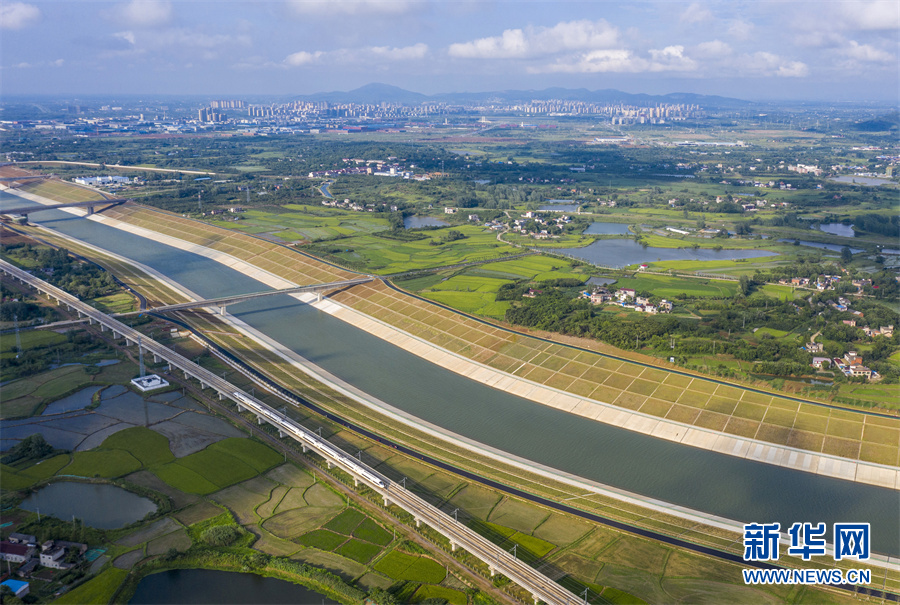 6月28日,安徽省合肥市廬江縣柯坦鎮(zhèn)境內的引江濟淮工程雄姿展現(xiàn),河道、高鐵、公路在綠野中交匯,景美如畫。
